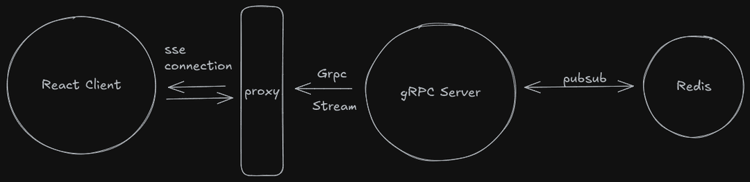 Let’s apply what we’ve learned by building a small implementation that demonstrates gRPC’s messaging and streaming capabilities. What are we building? We will create a simple application that allows users to send messages with their username and receive a stream of messages based on a subscribed room, using Server-Sent Events (SSE) for real-time notifications. Project Structure: We will create four repositories: A simple client using React A proxy server to act as a bridge between the client and other services A Redis server for message broadcasting A gRPC server to handle messaging and streaming logic